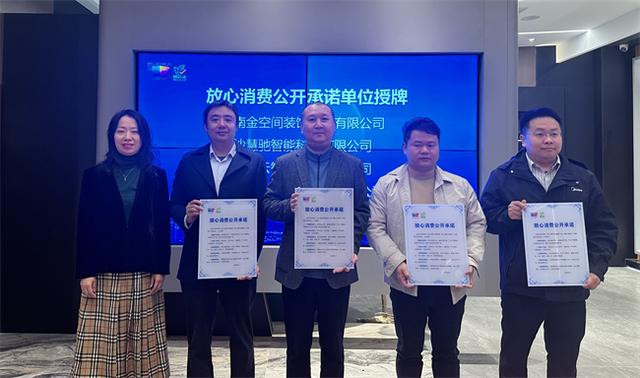 活动现场,长沙市市场监督管理局消保处处长宋洁向湖南金空间装饰工程有限公司、长沙慧驰智能科技有限公司等4家企业授予“放心消费公开承诺单位”牌匾。随后,金空间装饰与20家入驻企业代表共同宣读《放心消费公开承诺书》,向社会作出郑重承诺。